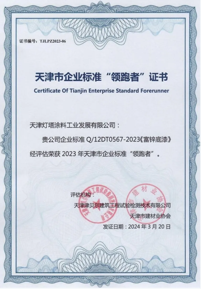 近日,天津市標準化研究院公布了2023年天津市企業(yè)標準“領跑者”入圍名單,燈塔涂料成功入選。 燈塔富鋅底漆由環(huán)氧樹脂、高純度鋅粉、助劑、聚酰胺或改性胺類固化劑、有機溶劑等制成。產品具有優(yōu)異的防腐性能、力學性能,附著力強,與環(huán)氧或聚氨酯型面漆配套使用。產品可用于橋梁、海港工程、港口機械、石油石化等鋼結構重防腐底漆。 天津市企業(yè)標準”領跑者“是天津市標準化研究院按照《天津市實施企業(yè)...