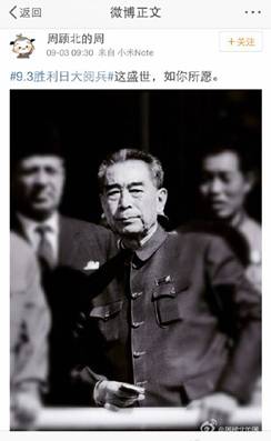 讓人難忘的細節(jié)不僅僅在閱兵場上。3日上午9時30分,習近平主席偕夫人彭麗媛正在天安門迎候各國嘉賓,閱兵尚未正式開始,會場內外興奮期待的氛圍漸濃。就在此時,網(wǎng)友“周顧北的周”發(fā)布了一條微博“這盛世,如你所愿”,配圖是一張周恩來總理的老照片。短短的七字微博引發(fā)了網(wǎng)友的強烈共鳴,轉發(fā)已過百萬。“開國大典的時候飛機不夠,周總理說飛兩遍,現(xiàn)在再也不需要飛兩遍了,要多少有多少。山河猶在,國泰民安。當年送你的十里長安街,如今已是十里繁榮?!?/p>