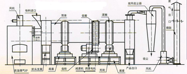 回轉(zhuǎn)式烘干機(jī)主要由回轉(zhuǎn)體、擋料板、傳動(dòng)裝置、支承裝置等部件組成。其工作原理:利用擺布合理,角度交替變更均布于筒體內(nèi)的揚(yáng)料板,把含水物料拋灑在旋轉(zhuǎn)的筒體內(nèi),經(jīng)熱氣流把水份從物料中分泌出來(lái),變成水蒸氣排放于大氣中而進(jìn)行干燥。