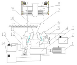 5 磨盤裝置           6 磨輥             7 錐斗         8 多頭選粉機(jī)