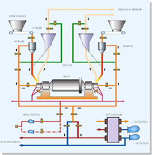 雙進雙出球磨機具有兩個完全對稱的粉磨回路,其工作原理如下:原煤通過能自動控制速度的給煤機進入落煤管,靠重力的作用落入輸送裝置的下方,被旋轉(zhuǎn)的絞籠送入磨煤機的筒體,旋轉(zhuǎn)的筒體內(nèi)裝有一定量的鋼球,把原煤研磨成煤粉。一次風從磨煤機兩側(cè)的中空管進入磨機的筒體,對原煤和煤粉進行干燥,并將磨制好的煤粉通過絞籠體的環(huán)形通道輸送到磨煤機上方的分離器中,不合格的粗煤粉返回筒體內(nèi)重新粉磨,合格的細粉被送到鍋爐的燃燒器。部分一次風進入混料箱,對原煤進行充分預干燥后進入磨煤機分離器,與入磨一次風混合,共同完成對煤粉的進一步干燥和輸送。